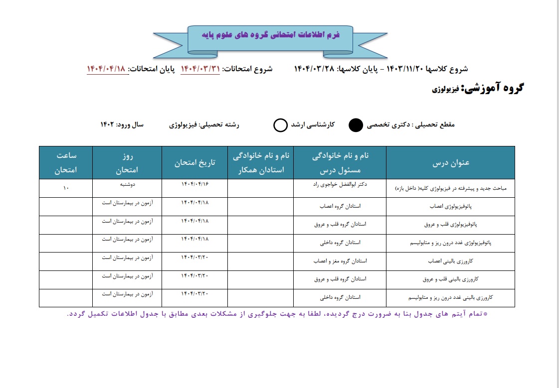 | برنامه ی امتحانی گروه فیزیولوژی در سال تحصیلی1403-1402- نیم سال دوم |
