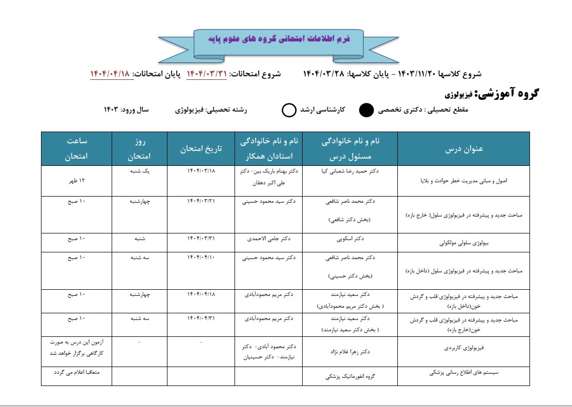 | برنامه ی امتحانی گروه فیزیولوژی در سال تحصیلی1404-1403 - نیم سال دوم | |